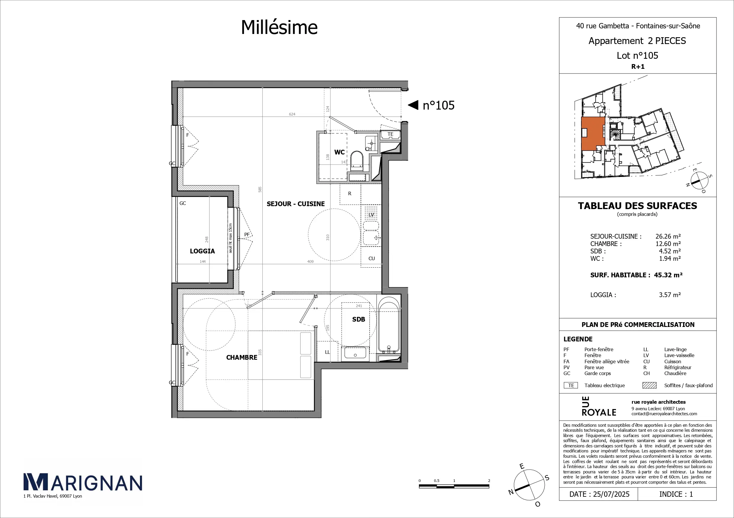 Vivez dans un 2 pièces de 45,32 m² pensé pour votre confort et votre bien-être. Profitez d’une loggia de 3,57 m², parfaite pour un coin lecture, un café en matinée ou quelques plantes vertes. Situé au 1er étage avec orientation Nord, cet appartement offre un espace lumineux et agréable tout au long de la journée. Un stationnement privatif (P018) complète ce logement pour un quotidien pratique.